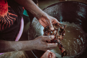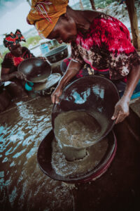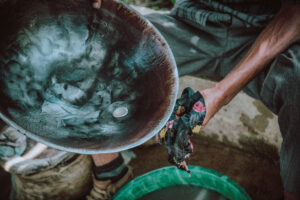 Najpierw schodzi się 300 metrów pod ziemię, w kasku i kombinezonie, na mechanicznym wyciągu górnicy opuszczani są ręcznie, przez 2-4 mężczyzn kręcących kołowrotkiem. Na dnie panuje ciemność i duchota. Górnicy nie szukają złota, ich zadaniem jest rozkuwanie ziemi i wsypywanie gruzu do worków, a gdy to jest gotowe, mężczyźni na górze wciągają worki i układają je w rządkach pod ścianą. Wszystko jest stworzone prowizorycznie, podpory tuneli puszczają stosunkowo często, do tego tereny te nawiedzane są przez trzęsienia ziemi. W kopalniach ginie od kilka do kilkunastu osób rocznie. Worki z ziemią trafiają do tzw. zgniatacza, pięciokątnego bębna, wewnątrz którego znajdują się ogromne, ołowiane kule. Bęben wraz z ziemią i kamieniami kręci się, kule ubijają gruz i mielą go na mąkę, metal walący o metal i kamienie, wszystko tak głośne, że każdy zgniatacz słyszany jest z odległości nawet kilku kilometrów, przez co cały proces musi ustawać na noc, bo nie dałoby się przy tym dźwięku spać. Ziemi do przetworzenia jest jednak tak dużo, że proces ten jest niemal nieprzerwany, a niektóre zgniatarki działają również po zachodzie słońca. Ubita ziemia trafia do pierwszych płuczek. Pył przesypywany jest przez pudła z sitkiem i tam oblewany wodą. Błoto spływa po obłożonej szmatą taśmie. Złoto jest ciężkie, więc zostaje w materiale, reszta przesiąka przez szmatki i spływa do kanału na dole, gdzie przerzucana jest łopatami na stosy. W tonie ziemi znajduje się kilka gram złota, to stosunkowo duże ilości kruszcu, wydobycie się opłaca, w ten sposób jednak powstają całe masy niepotrzebnej ziemi, z której usypywane są w okolicy całe sztuczne wzgórza, które z czasem obrastają tutejszą ubogą roślinnością. Wyselekcjonowana ziemia trafia do kolejnych płuczek, tym razem przeważnie są to kobiety. W betonowych basenach znajduje się woda z rtęcią, którą miesza się z ciężką ziemią. Rtęć wybija złoto i po kilku razach wypłukiwania, płuczki filtrują wodę przez szmatkę, ugniatają kulki z rtęci, a z nich kruszy się złoto. Cały proces obserwowany jest przez bogatszych, lepiej ubranych nadzorców ze złotymi łańcuchami i zegarkami. Nadzorcy bardzo uważnie pilnują czy płuczki nie chowają niczego w dłoniach i czy wszystko ze szmatek zostało dobrze wypłukane. Złoto, jeszcze w postaci białego proszku, trafia do palarni gdzie wysokiej temperaturze poddawane jest dwukrotnie. Dopiero po tym procesie przyjmuje swoją charakterystyczną barwę. Na sam koniec kruszec jest ważony. 300 metrów pod ziemią, brak tlenu i wody, w skutek wypadków przy pracy rocznie ginie co najmniej kilku ludzi. Zdarzają się zawały ziemi, trzęsienia, pękają podpory, tunele zalewa woda (woda wypompowywana jest stale, więc zagrożenie zalania występuje gdy np. braknie prądu). Na terenie wioski istnieją dziesiątki odwiertów, cześć jest oficjalna, zarządzana przez firmę, druga część jest dzika, zatrudnienie znaleźć tam mogą lokalni mieszkańcy, na czarno. Prosty górnik zarabia najmniej, dniówkę traci najczęściej jeszcze tego samego wieczoru na rozrywki, kolejnego dnia musi przyjść znów by poddać się katorżniczej pracy. 300 metrów pod ziemię, z minimalnymi zabezpieczeniami, ryzykując życie. Ceny złota podaje się w amerykańskich dolarach za tzw. uncję trojańską, czyli 31,1035 gram. Dziś taka ilość warta jest ponad 1700 dolarów, wartość oczywiście zmienia się codziennie zgodnie z wahaniami światowych giełd. Dlaczego złoto jest więcej warte niż wszystkie pozostałe kruszce? Zasada jest banalnie prosta i dotyczy wartości każdego przedmiotu na świecie – im jest go więcej, tym niższa jest jego wartość. Od blisko czterech tysięcy lat do dziś wydobyto 190 tysięcy ton złota, dla porównanie roczne wydobycie węgla, tylko w Polsce, wynosi 1,4 miliona ton, czyli złota w historii wydobyto w ilości zaledwie 10% rocznego wydobycia węgla tylko w jednym kraju. Żeby jeszcze bardziej to zobrazować, całego złota wystarczyłoby do zbudowania jednego bloku mieszkalnego o wysokości około 4 pięter. Są jednak inne metale występujące jeszcze rzadziej, jednak ich wartość jest albo zbyt wysoka, albo ich właściwości nieodpowiednie. Złoto jest metalem szlachetnym, ciężkim ale miękkim, dającym możliwości obróbki, nie utlenia się i jest odporny na niemal wszystkie kwasy. Żądza złota doprowadziła do śmierci milionów ludzi na całym świecie.